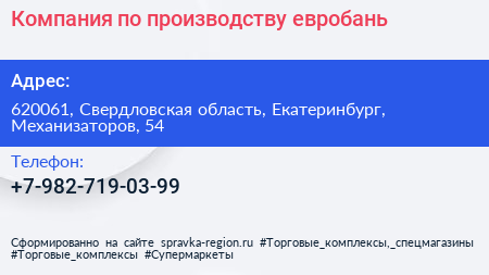 Компания по производству евробань по адресу 620061, Свердловская область, Екатеринбург, Механизаторов, 54 в дальнейшем Организация, размещена в следующих категориях: