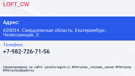 LOFT_CW по адресу 620014, Свердловская область, Екатеринбург, Челюскинцев, 2 в дальнейшем Организация, размещена в следующих категориях: