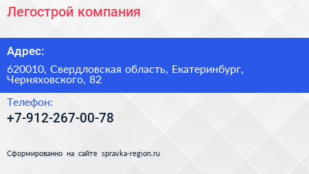 Легострой, компания по адресу 620010, Свердловская область, Екатеринбург, Черняховского, 82 в дальнейшем Организация, размещена в следующих категориях:
