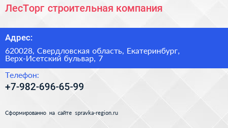 ЛесТорг, строительная компания по адресу 620028, Свердловская область, Екатеринбург, Верх-Исетский бульвар, 7 в дальнейшем Организация, размещена в следующих категориях: