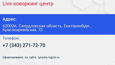 Live, коворкинг-центр по адресу 620026, Свердловская область, Екатеринбург, Красноармейская, 72 в дальнейшем Организация, размещена в следующих категориях: