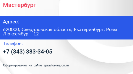 Мастербург по адресу 620000, Свердловская область, Екатеринбург, Розы Люксембург, 12 в дальнейшем Организация, размещена в следующих категориях: