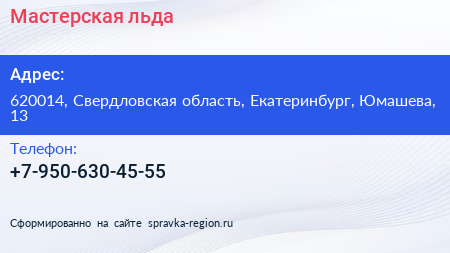 Мастерская льда по адресу 620014, Свердловская область, Екатеринбург, Юмашева, 13 в дальнейшем Организация, размещена в следующих категориях: