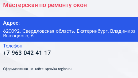Мастерская по ремонту окон по адресу 620092, Свердловская область, Екатеринбург, Владимира Высоцкого, 6 в дальнейшем Организация, размещена в следующих категориях:
