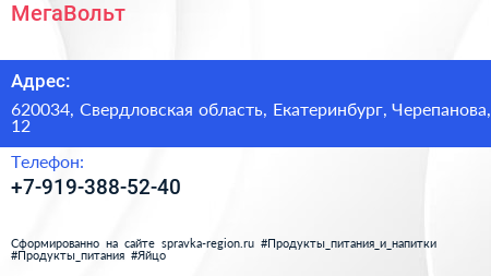 МегаВольт по адресу 620034, Свердловская область, Екатеринбург, Черепанова, 12 в дальнейшем Организация, размещена в следующих категориях: