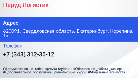 Неруд Логистик по адресу 620091, Свердловская область, Екатеринбург, Корепина, 1а в дальнейшем Организация, размещена в следующих категориях:
