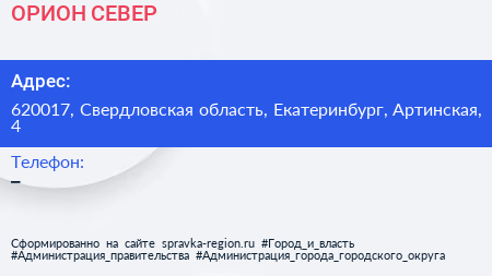 ОРИОН-СЕВЕР по адресу 620017, Свердловская область, Екатеринбург, Артинская, 4 в дальнейшем Организация, размещена в следующих категориях: