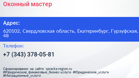 Оконный мастер по адресу 620102, Свердловская область, Екатеринбург, Гурзуфская, 48 в дальнейшем Организация, размещена в следующих категориях: