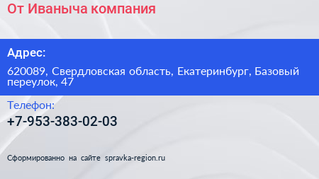 От Иваныча, компания по адресу 620089, Свердловская область, Екатеринбург, Базовый переулок, 47 в дальнейшем Организация, размещена в следующих категориях: