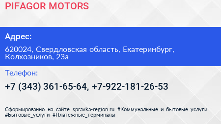PIFAGOR MOTORS по адресу 620024, Свердловская область, Екатеринбург, Колхозников, 23а в дальнейшем Организация, размещена в следующих категориях: