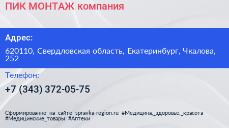 ПИК МОНТАЖ, компания по адресу 620110, Свердловская область, Екатеринбург, Чкалова, 252 в дальнейшем Организация, размещена в следующих категориях: