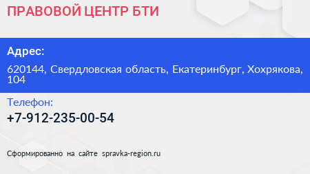 ПРАВОВОЙ ЦЕНТР БТИ по адресу 620144, Свердловская область, Екатеринбург, Хохрякова, 104 в дальнейшем Организация, размещена в следующих категориях: