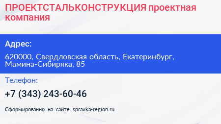ПРОЕКТСТАЛЬКОНСТРУКЦИЯ, проектная компания по адресу 620000, Свердловская область, Екатеринбург, Мамина-Сибиряка, 85 в дальнейшем Организация, размещена в следующих категориях: