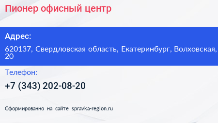 Пионер, офисный центр по адресу 620137, Свердловская область, Екатеринбург, Волховская, 20 в дальнейшем Организация, размещена в следующих категориях: