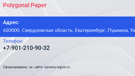 Polygonal Paper по адресу 620000, Свердловская область, Екатеринбург, Пушкина, 9а в дальнейшем Организация, размещена в следующих категориях: