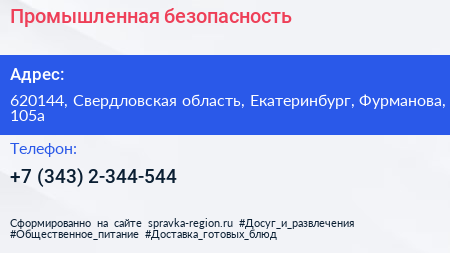 Промышленная безопасность по адресу 620144, Свердловская область, Екатеринбург, Фурманова, 105а в дальнейшем Организация, размещена в следующих категориях: