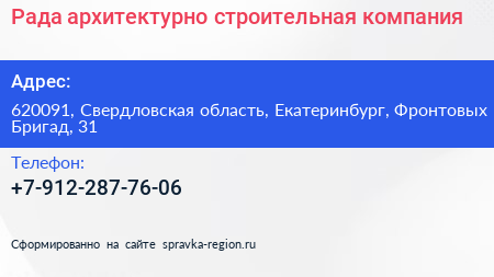 Рада, архитектурно-строительная компания по адресу 620091, Свердловская область, Екатеринбург, Фронтовых Бригад, 31 в дальнейшем Организация, размещена в следующих категориях: