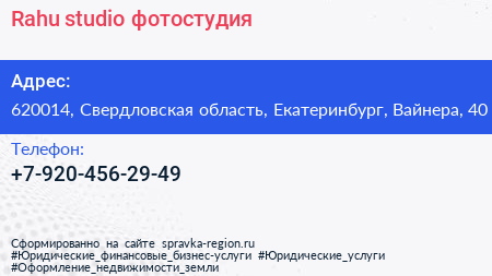 Rahu studio, фотостудия по адресу 620014, Свердловская область, Екатеринбург, Вайнера, 40 в дальнейшем Организация, размещена в следующих категориях: