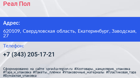 Реал-Пол по адресу 620109, Свердловская область, Екатеринбург, Заводская, 27 в дальнейшем Организация, размещена в следующих категориях: