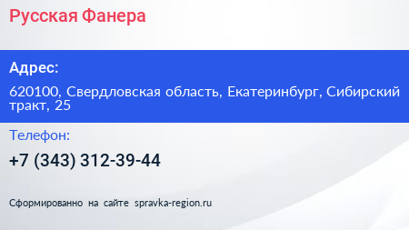 Русская Фанера по адресу 620100, Свердловская область, Екатеринбург, Сибирский тракт, 25 в дальнейшем Организация, размещена в следующих категориях: