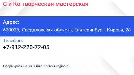 С и Ко, творческая мастерская по адресу 620028, Свердловская область, Екатеринбург, Кирова, 28 в дальнейшем Организация, размещена в следующих категориях: