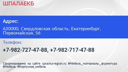 ШПАЛАЕКБ по адресу 620000, Свердловская область, Екатеринбург, Первомайская, 56 в дальнейшем Организация, размещена в следующих категориях: