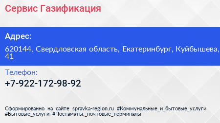 Сервис-Газификация по адресу 620144, Свердловская область, Екатеринбург, Куйбышева, 41 в дальнейшем Организация, размещена в следующих категориях: