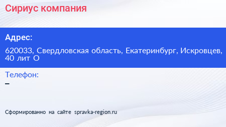 Сириус, компания по адресу 620033, Свердловская область, Екатеринбург, Искровцев, 40 лит О в дальнейшем Организация, размещена в следующих категориях: