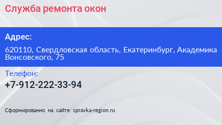 Служба ремонта окон по адресу 620110, Свердловская область, Екатеринбург, Академика Вонсовского, 75 в дальнейшем Организация, размещена в следующих категориях: