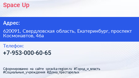 Space-Up по адресу 620091, Свердловская область, Екатеринбург, проспект Космонавтов, 46а в дальнейшем Организация, размещена в следующих категориях: