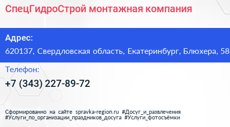СпецГидроСтрой, монтажная компания по адресу 620137, Свердловская область, Екатеринбург, Блюхера, 58 в дальнейшем Организация, размещена в следующих категориях: