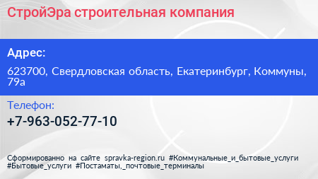 СтройЭра, строительная компания по адресу 623700, Свердловская область, Екатеринбург, Коммуны, 79а в дальнейшем Организация, размещена в следующих категориях: