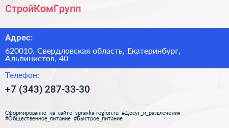СтройКомГрупп по адресу 620010, Свердловская область, Екатеринбург, Альпинистов, 40 в дальнейшем Организация, размещена в следующих категориях: