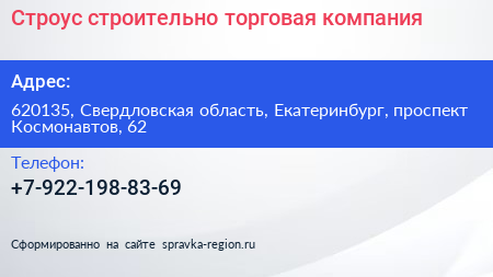 Строус, строительно-торговая компания по адресу 620135, Свердловская область, Екатеринбург, проспект Космонавтов, 62 в дальнейшем Организация, размещена в следующих категориях: