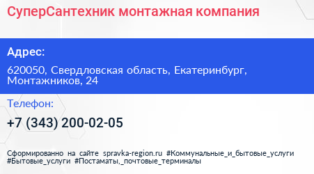 СуперСантехник, монтажная компания по адресу 620050, Свердловская область, Екатеринбург, Монтажников, 24 в дальнейшем Организация, размещена в следующих категориях: