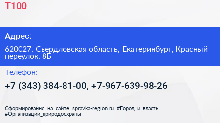T100 по адресу 620027, Свердловская область, Екатеринбург, Красный переулок, 8Б в дальнейшем Организация, размещена в следующих категориях: