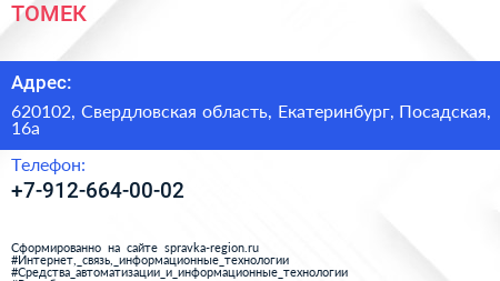 ТОМЕК по адресу 620102, Свердловская область, Екатеринбург, Посадская, 16а в дальнейшем Организация, размещена в следующих категориях: