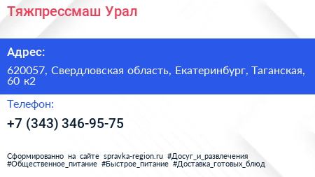 Тяжпрессмаш-Урал по адресу 620057, Свердловская область, Екатеринбург, Таганская, 60 к2 в дальнейшем Организация, размещена в следующих категориях: