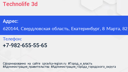 Technolife-3d по адресу 620144, Свердловская область, Екатеринбург, 8 Марта, 82 в дальнейшем Организация, размещена в следующих категориях: