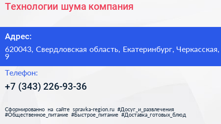 Технологии шума, компания по адресу 620043, Свердловская область, Екатеринбург, Черкасская, 9 в дальнейшем Организация, размещена в следующих категориях:
