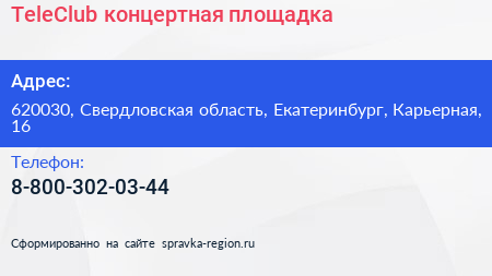 TeleClub, концертная площадка по адресу 620030, Свердловская область, Екатеринбург, Карьерная, 16 в дальнейшем Организация, размещена в следующих категориях: