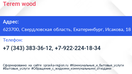 Terem wood по адресу 623700, Свердловская область, Екатеринбург, Исакова, 18 в дальнейшем Организация, размещена в следующих категориях: