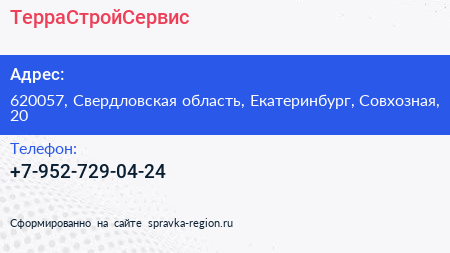 ТерраСтройСервис по адресу 620057, Свердловская область, Екатеринбург, Совхозная, 20 в дальнейшем Организация, размещена в следующих категориях: