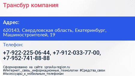 Трансбур, компания по адресу 620143, Свердловская область, Екатеринбург, Машиностроителей, 19 в дальнейшем Организация, размещена в следующих категориях: