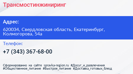 Трансмостинжиниринг по адресу 620034, Свердловская область, Екатеринбург, Колмогорова, 54а в дальнейшем Организация, размещена в следующих категориях: