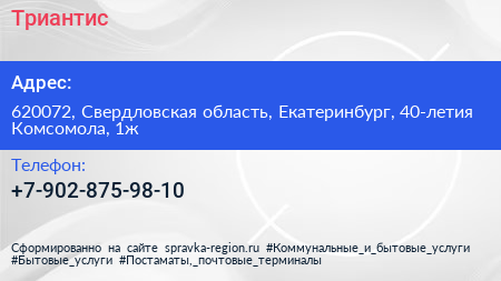 Триантис по адресу 620072, Свердловская область, Екатеринбург, 40-летия Комсомола, 1ж в дальнейшем Организация, размещена в следующих категориях: