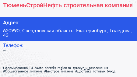 ТюменьСтройНефть, строительная компания по адресу 620990, Свердловская область, Екатеринбург, Толедова, 43 в дальнейшем Организация, размещена в следующих категориях: