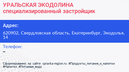 УРАЛЬСКАЯ ЭКОДОЛИНА, специализированный застройщик по адресу 620902, Свердловская область, Екатеринбург, Экодолья, 14 в дальнейшем Организация, размещена в следующих категориях: