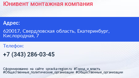 Юнивент, монтажная компания по адресу 620017, Свердловская область, Екатеринбург, Кислородная, 7 в дальнейшем Организация, размещена в следующих категориях: