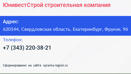 ЮнивестСтрой, строительная компания по адресу 620144, Свердловская область, Екатеринбург, Фрунзе, 96 в дальнейшем Организация, размещена в следующих категориях: